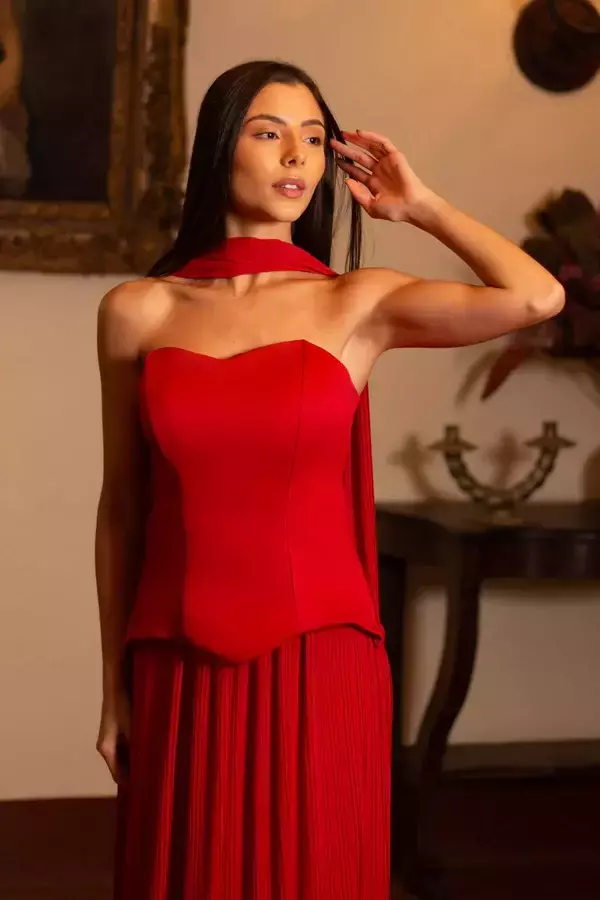 Vestido Longo Vermelho Drapeado Com Corpet Moda Luxo Exclusividade